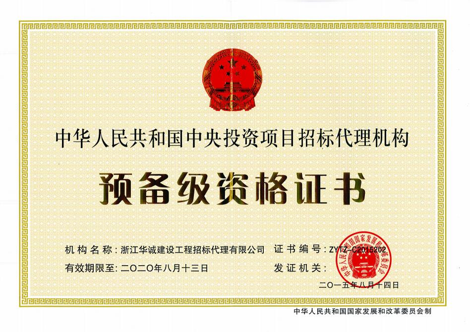 中央投資項目招標(biāo)代理機(jī)構(gòu)資格證書